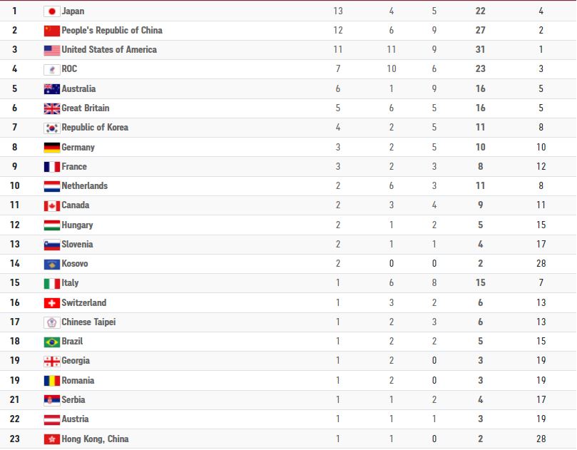 جدول الميداليات مع الترتيب. 31 ميدالية 11 ذهبية 11 فضية 9. تواصلت فعاليات أولمبياد طوكيو 2021 لليوم الحادي عشر على التوالي وسط منافسة شرسة بين عدد من الدول على التقدم في جدول ترتيب الميداليات.