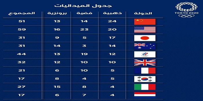 طوكيو 2020 تعرف على جدول ترتيب الميداليات بعد نهاية اليوم العاشر دار الهلال